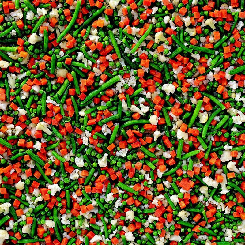 Blomkål 5-15 mm (27%), skurna gröna bönor (27%), tärnade morötter 10 mm (27%), ärtor medelfina (19%).